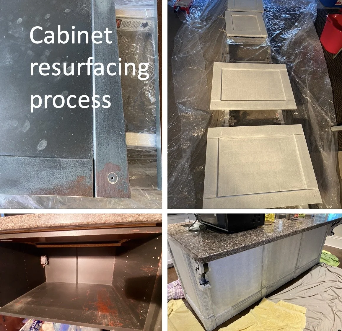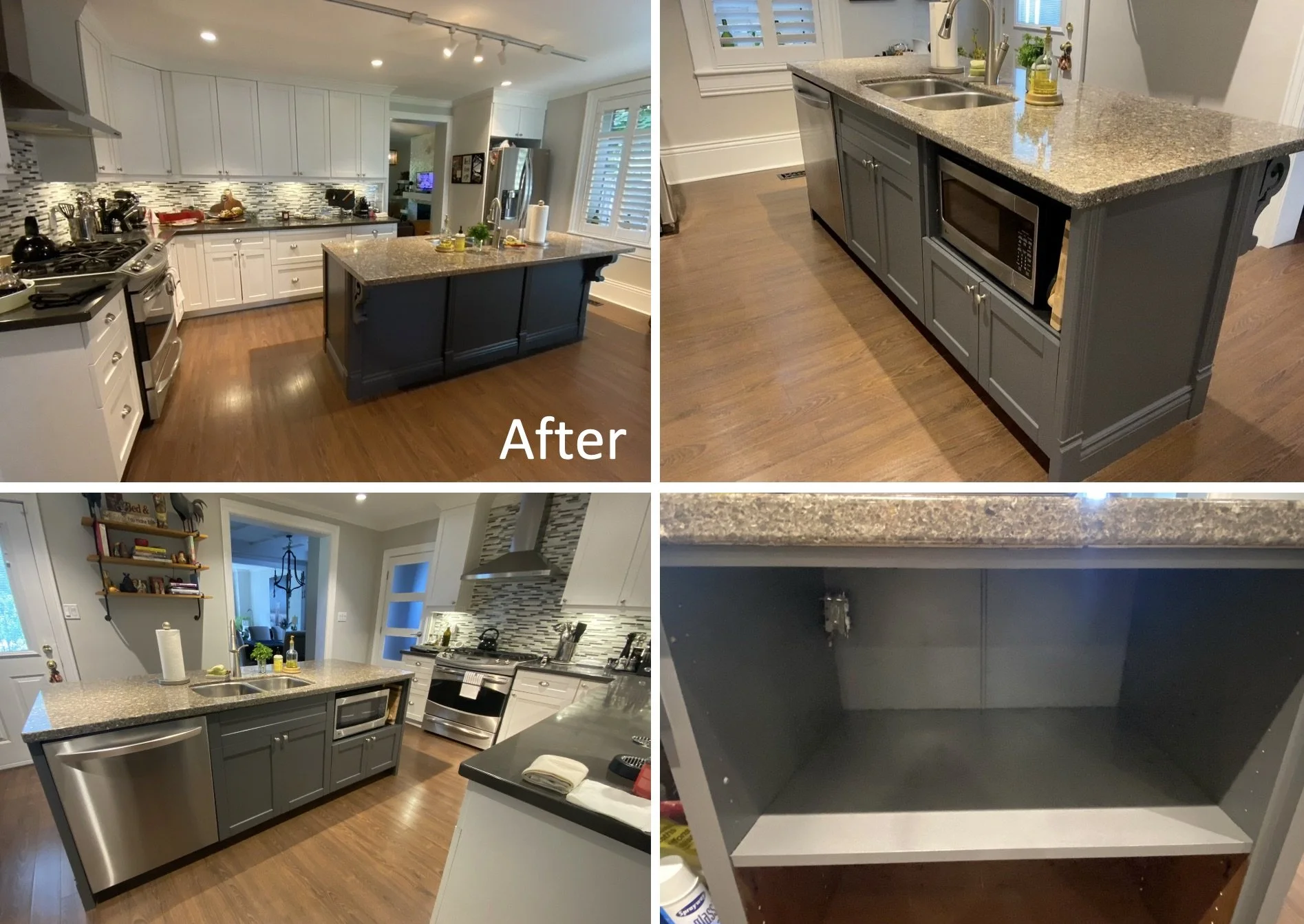 Cabinet resurfacing can be a cost effective way to update your kitchen. In this project the client did not want to incur the expense of replacing a very functional but heavily worn and tired kitchen island. We helped the client choosing the perfect colour and used our 6 step process ensures not just a beautiful finish but long lasting results. The process includes: Sanding; Applying industrial grade, oil based primer/sealer; Second sanding; and 3 top coats.