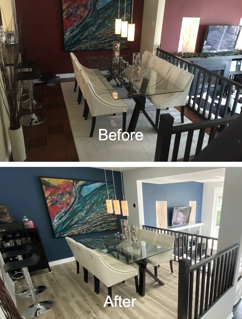 In this project we also transformed the floors by installing a floating luxury engineered floor over the old tile creating a light, fresh and updated look.